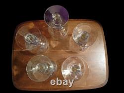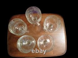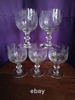 5 anciens très grands verres à pied Cristal soufflé et taillé Décor fleurs des champs Très bon état, peu de rayures, belle transparence et bien sonores Hauteur 16.5 cm ø pied 8.8 cm ø buvant 9.2 cm.